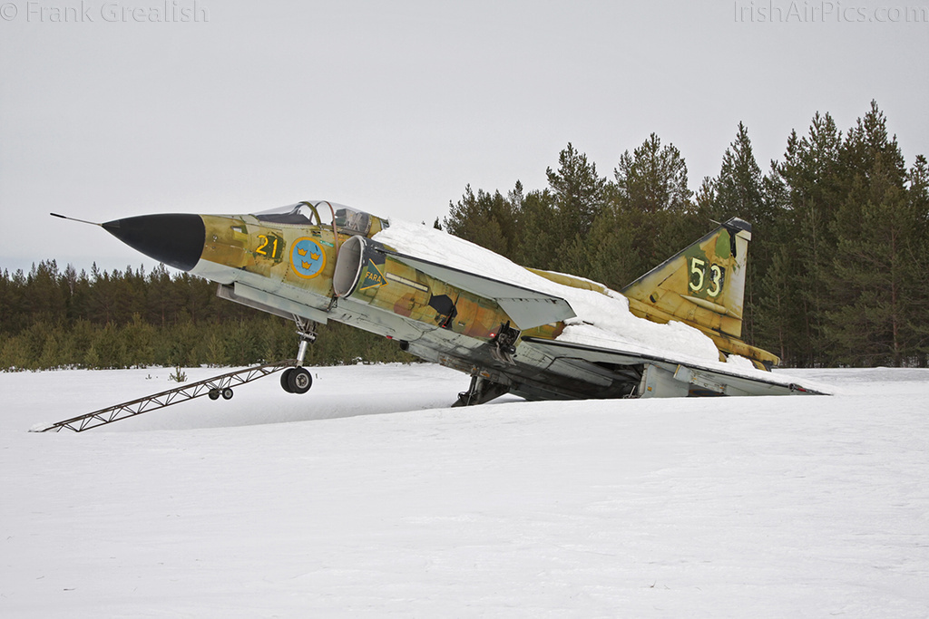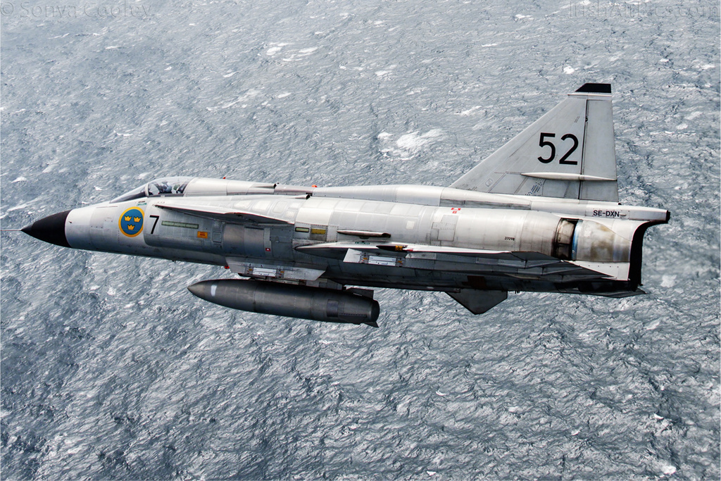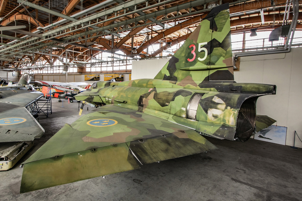 To facilitate operating from short runways, a powerful Volvo Flygmotor RM8 afterburning turbofan (a license-built version of the Pratt & Whitney JT8D with a Swedish-designed afterburner) is installed, this coupled with high lift canard fore-planes mounted each side of the air intakes helps get the aircraft off the ground in a hurry.