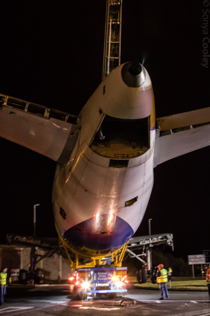 The wings of the plane had been removed a few days earlier, and on the day before the move the plane was placed onto the transporter using a custom support rig and made ready for the move. Once everything was ready, the move began. The transporter moved off at a slow pace, surrounded by an army of watchers guiding the plane past trees, lampposts, and an aircraft hangar. Every move was slow and deliberate, nothing was rushed.