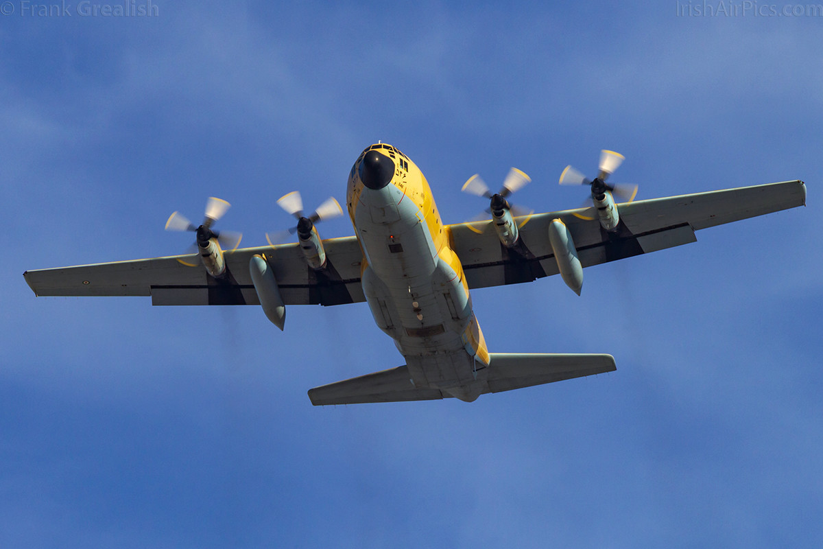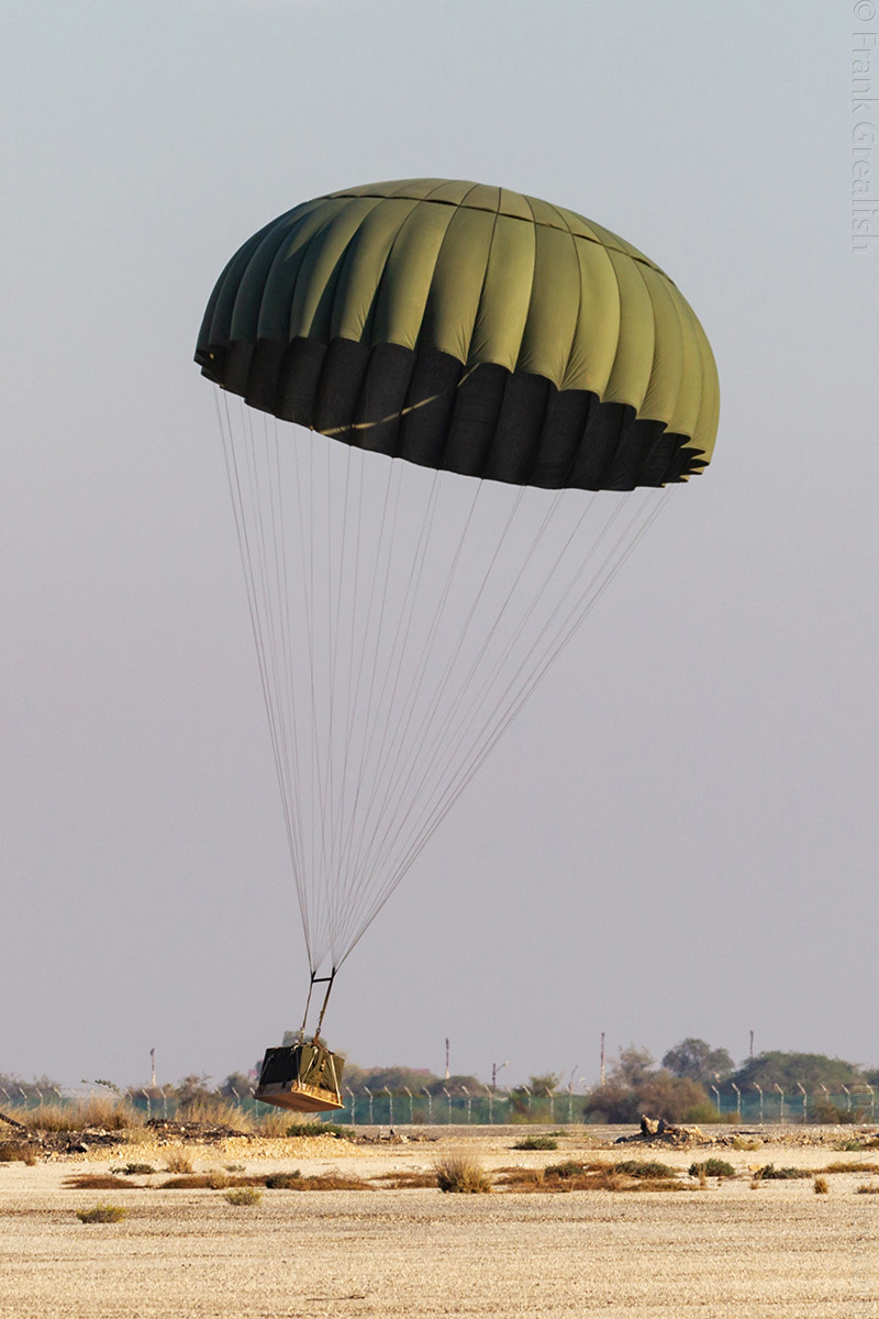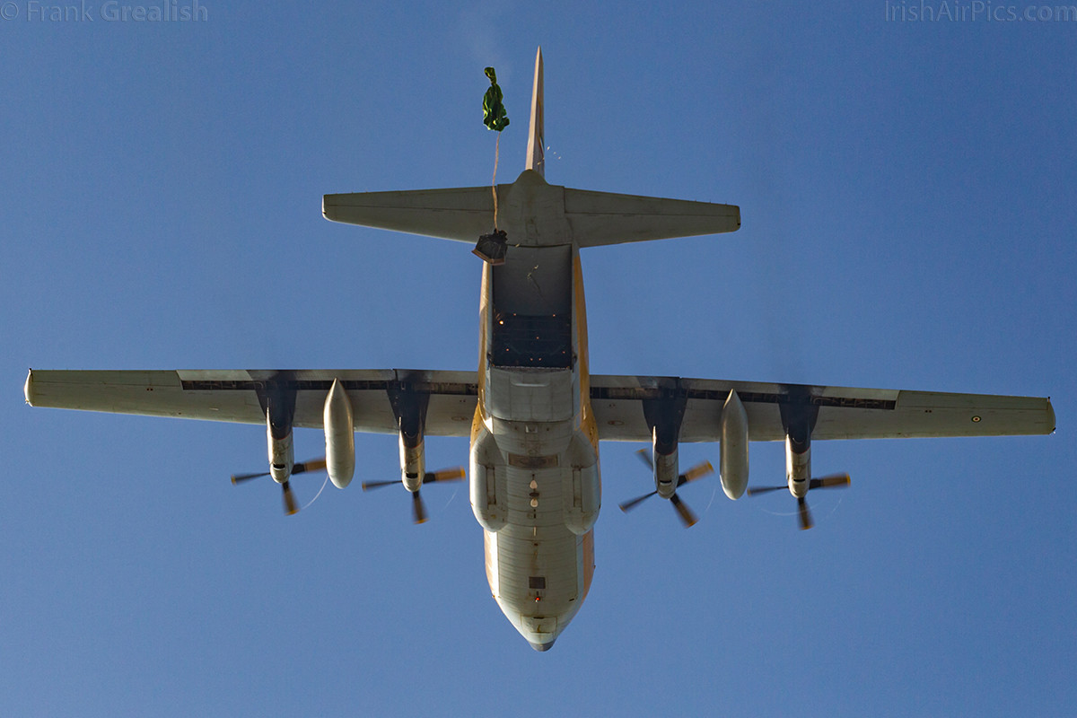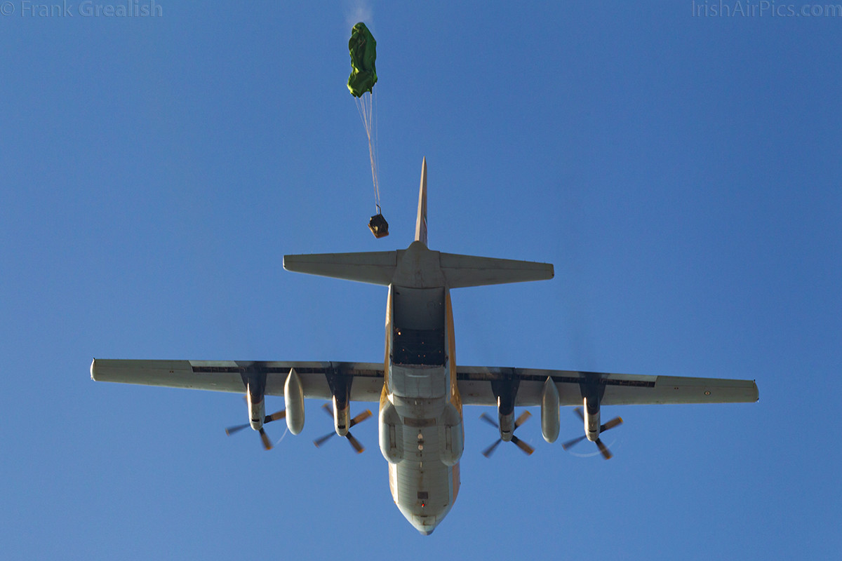 Once the formation had completed its flypast, the tanker departed, and the fighters prepared to come around to perform run and breaks. But before the fighters did their piece, on Monday a Lockheed C-130 Hercules did a flypast only, but on Tuesday it performed a parachute cargo drop, with the spotters area, which was on the south side of the runway away from the crowd line, being the aiming point. After the Tuesday cargo drop, the C-130 made no further appearances at the air show.
