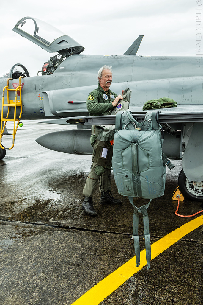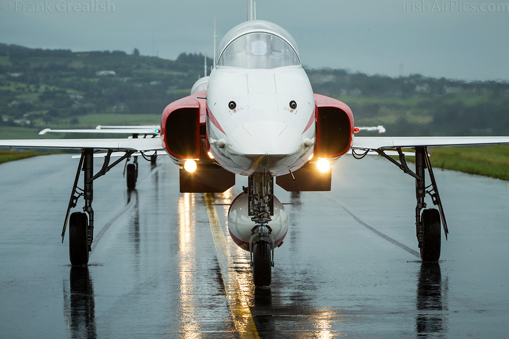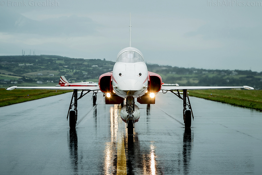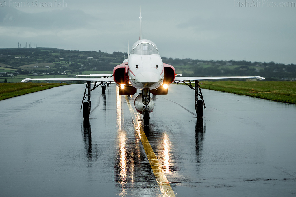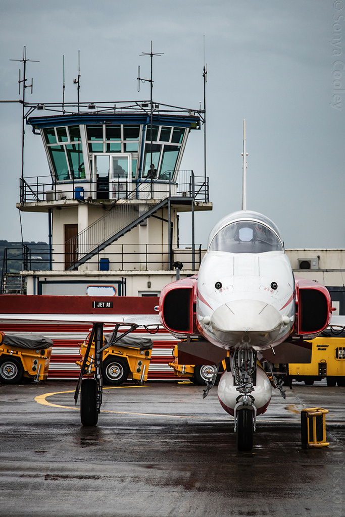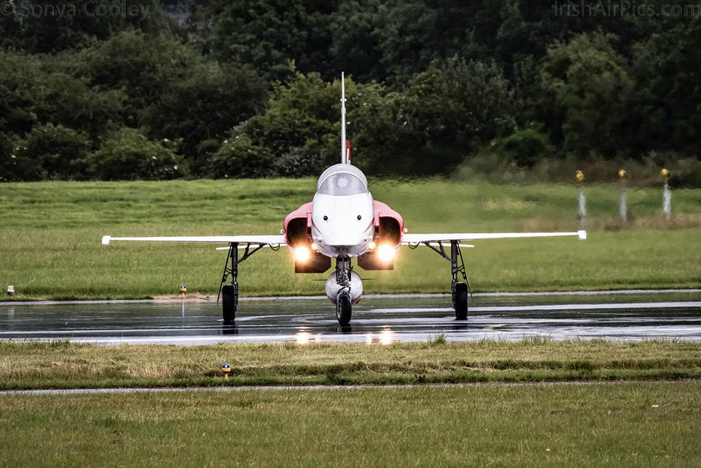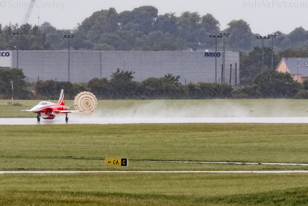 The team landed on the damp runway, brake parachutes trailing, seven aircraft in total. The team displays with six Northrop F-5E Tiger II supersonic fighter jets, six of the aircraft that arrived were painted in the distinctive red and white colours of the team, but as an added bonus the seventh spare aircraft was a standard grey F-5.