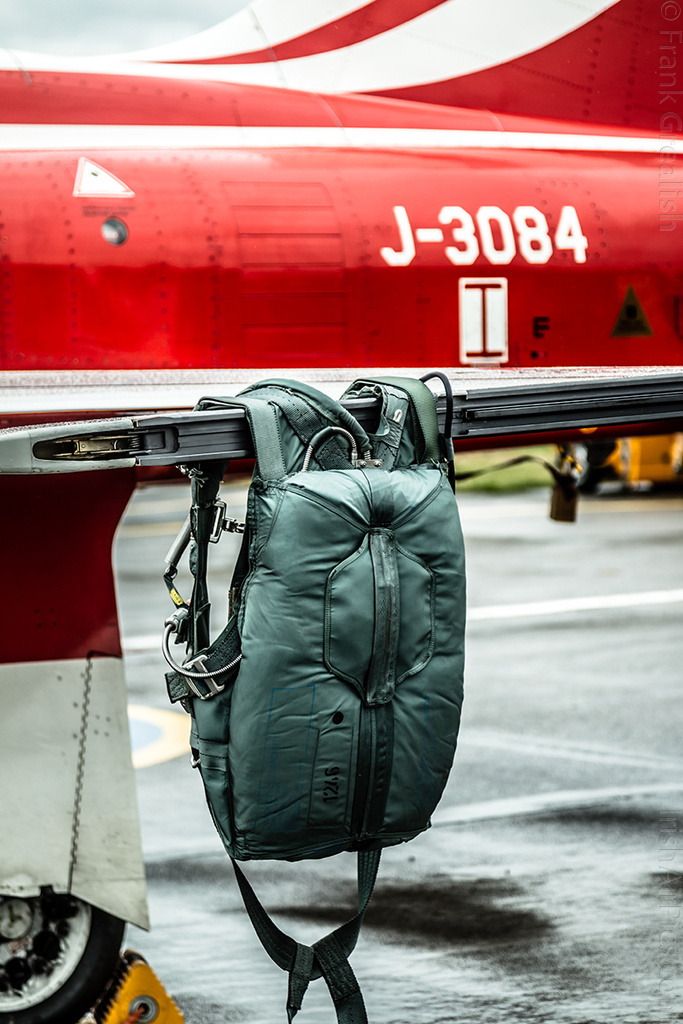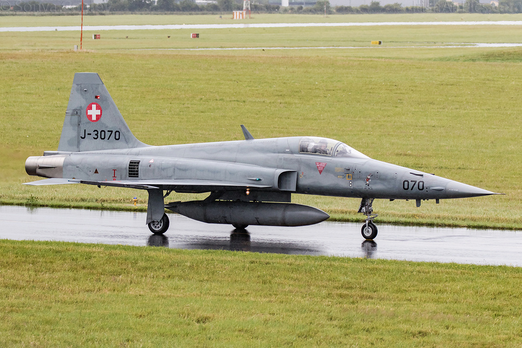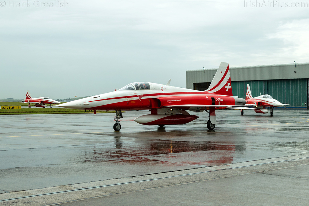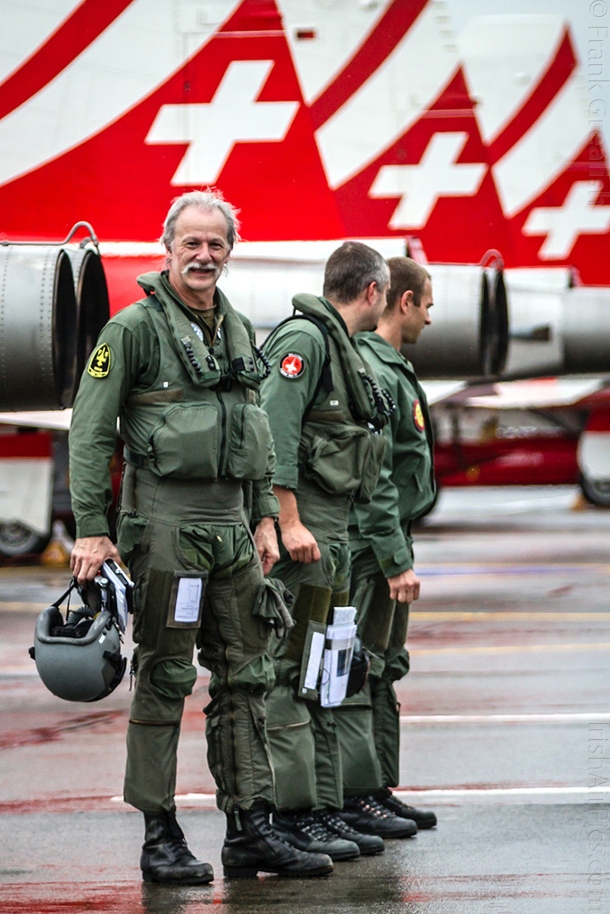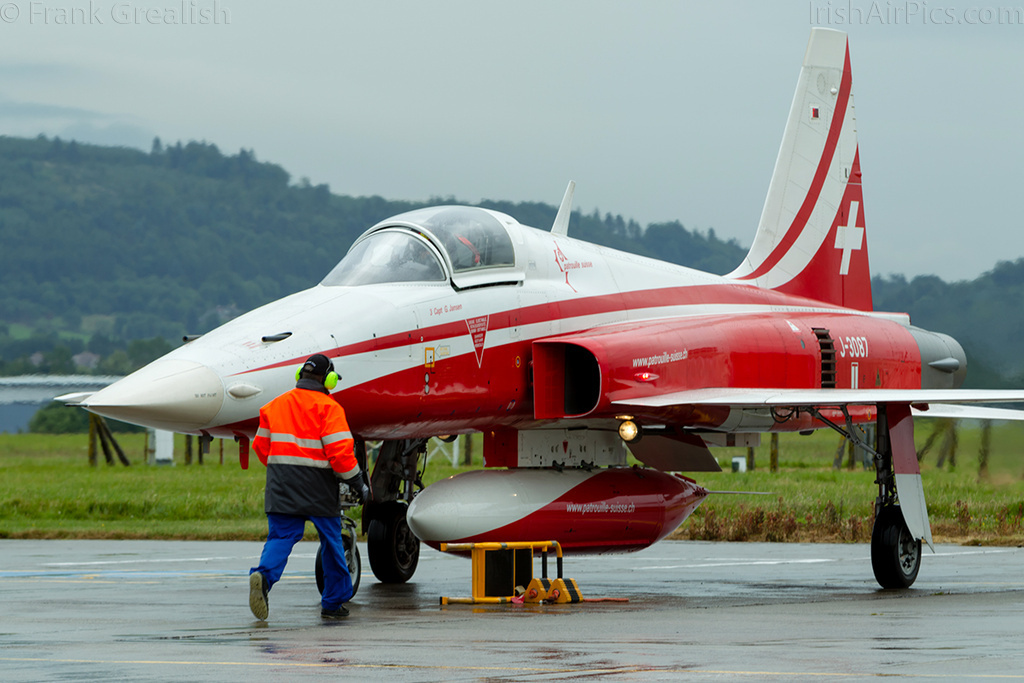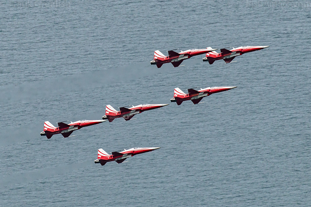 Earlier this year fatigue cracks were discovered in some of the Swiss Air Force's fleet of F-5's, and some of the aircraft that were affected were team aircraft. As a result the team flew with a mixed formation of red and white team aircraft, and standard grey aircraft for some displays carried out earlier in the display season.