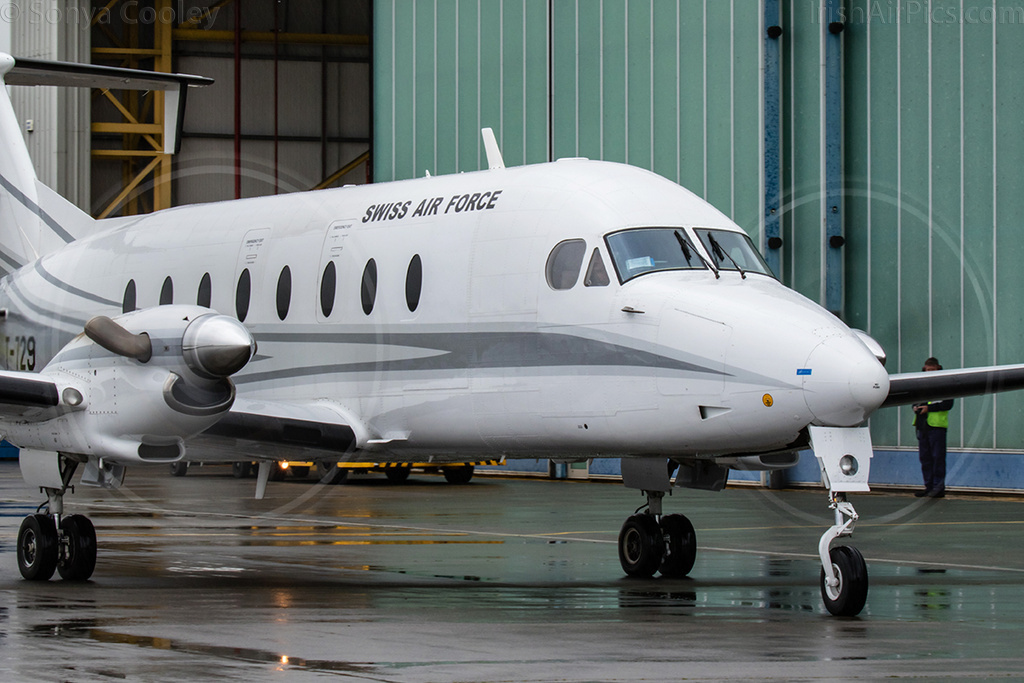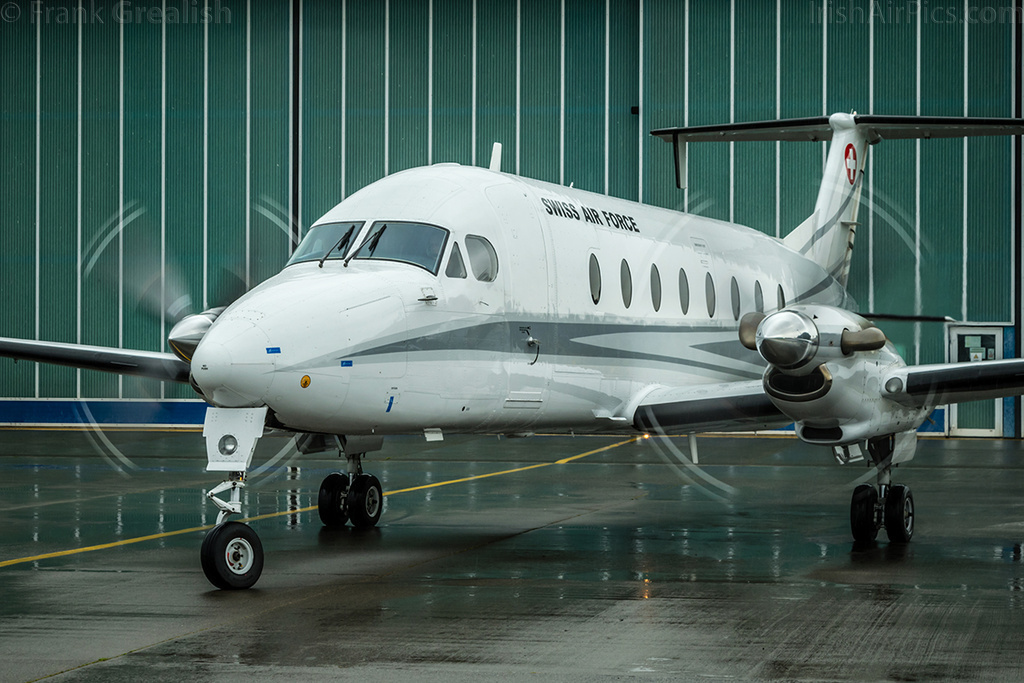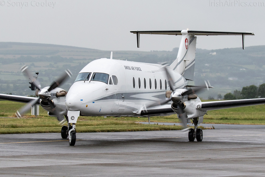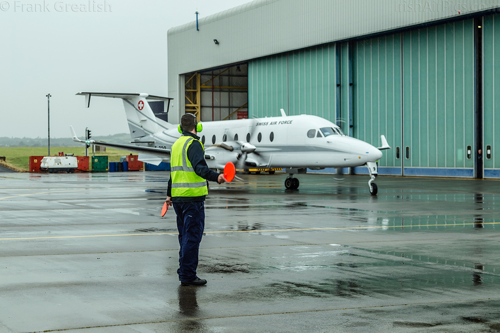 A quick run up and down the line of aircraft on the ramp for photos was carried out in case the rain returned, this turned out to be a prudent move as the rain did return, worse than ever. There was one more Swiss Air Force movement to wait for, the arrival of the team's support Beechcraft 1900. This was photographed from under the (relative) shelter of an Air Corps CASA CN-235's wing.